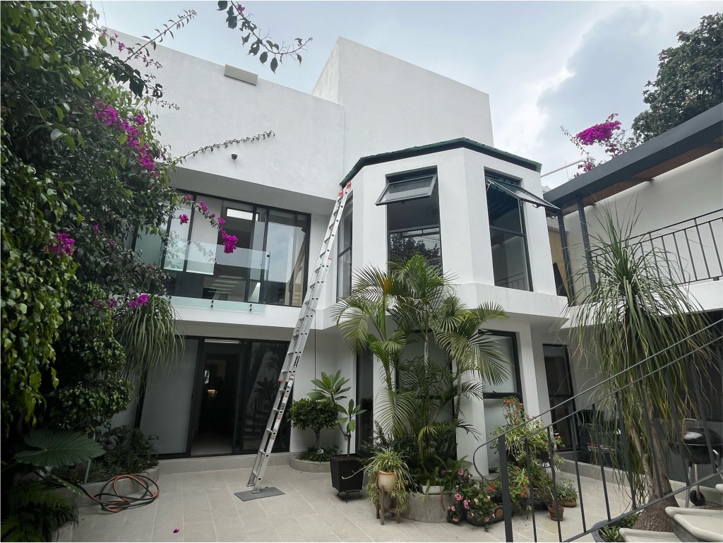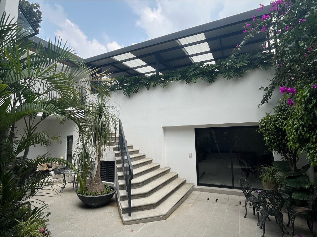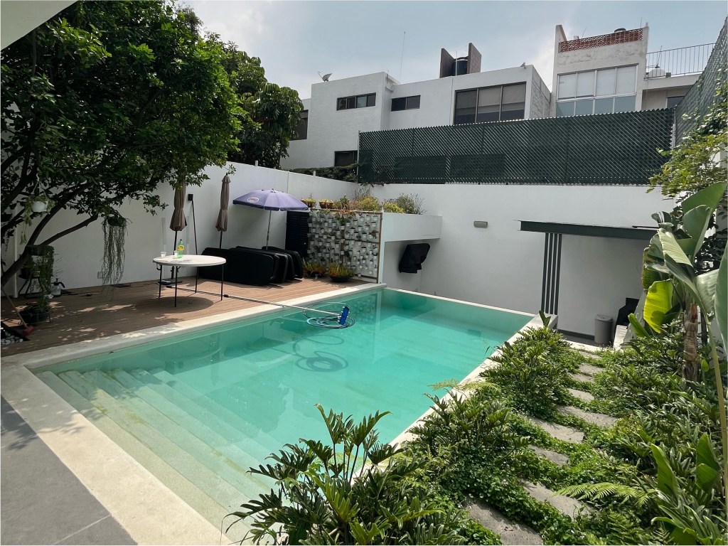 La fachada y los acabados se modernizaron con una paleta neutra y elegante, mientras que el jardín se convirtió en una terraza con alberca y vegetación integrada: el nuevo corazón social de la casa.