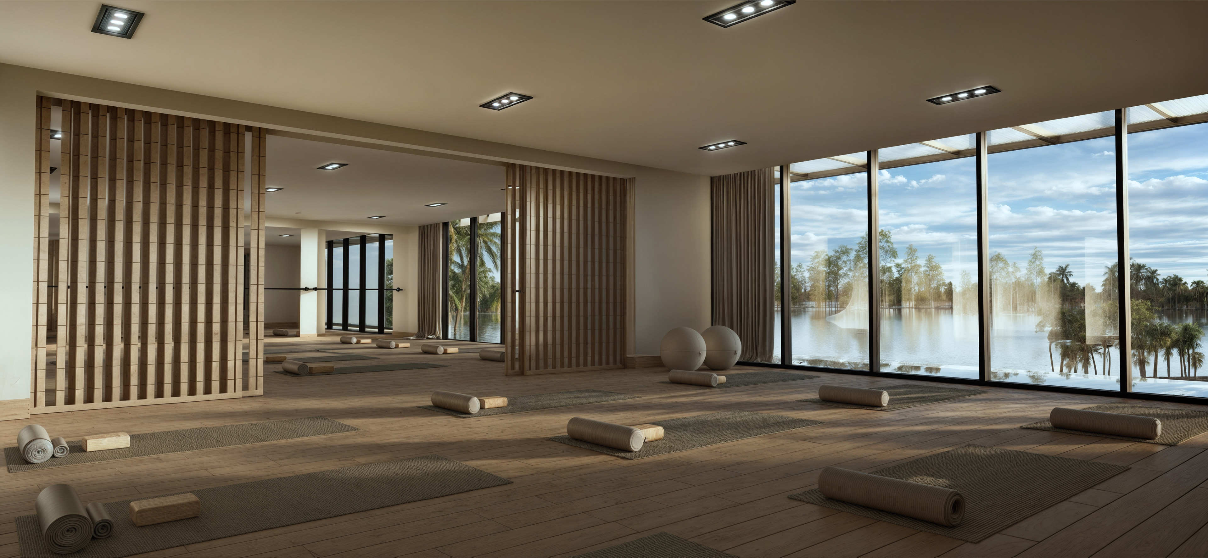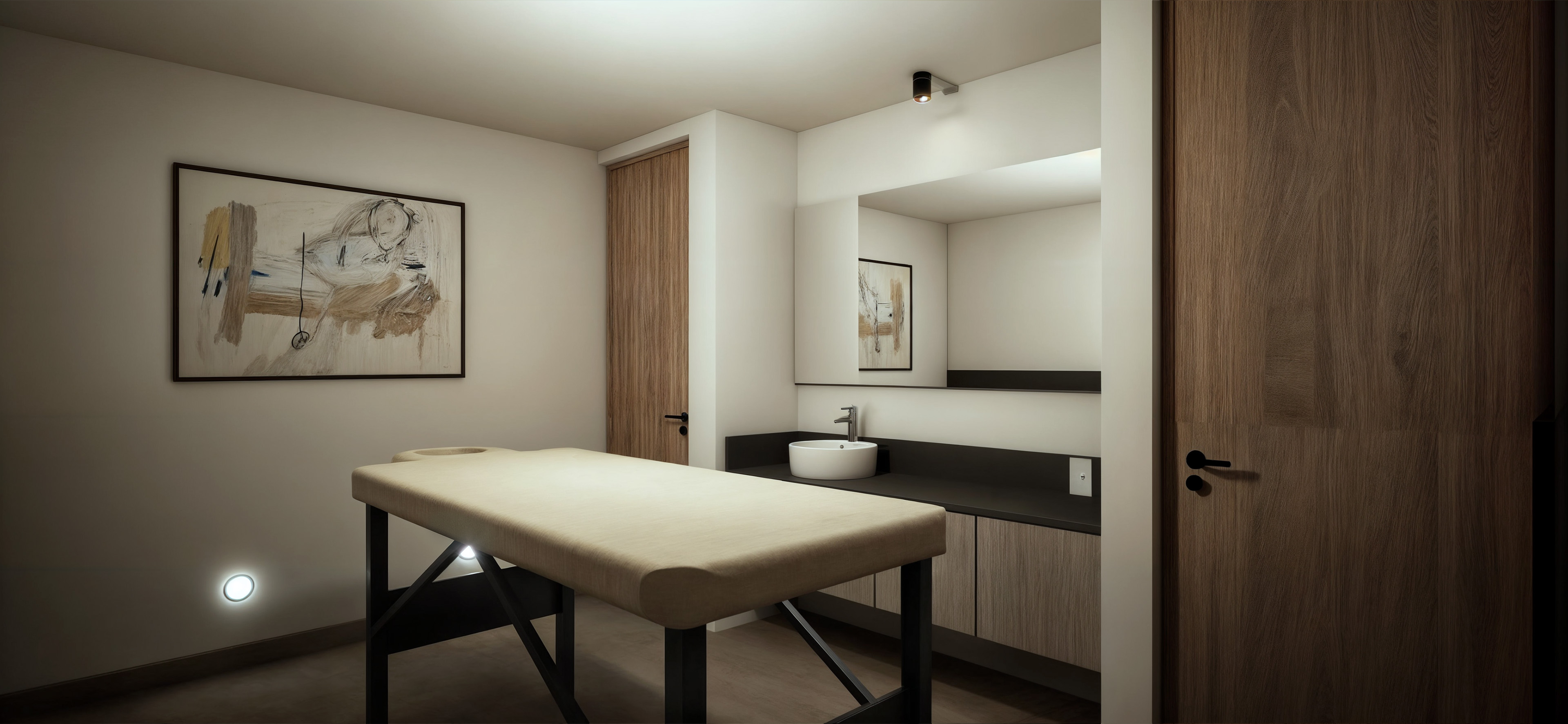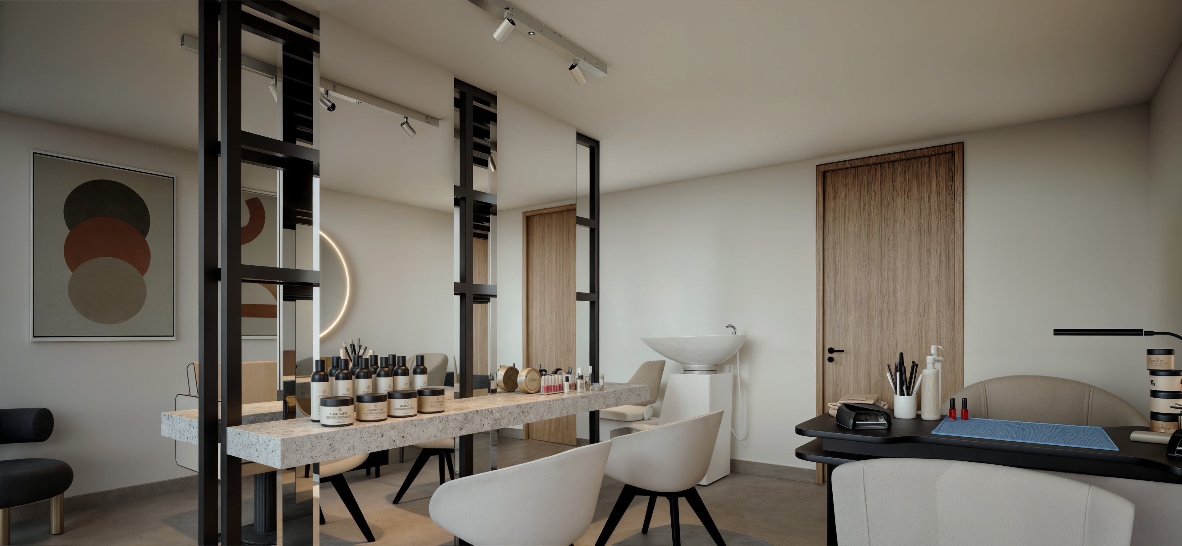 La intervención abarca espacios clave como la recepción y plaza central, oficinas administrativas, vestidores de adultos e infantiles, spa, salón de belleza y barber shop, gimnasio, salones polivalentes, kids club, work café y áreas de colaboradores.